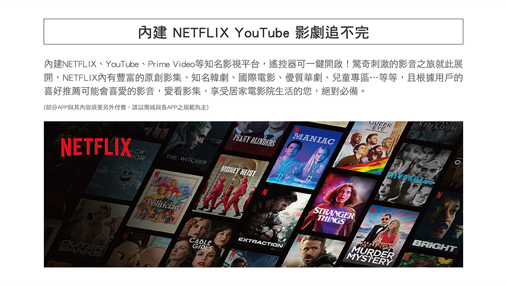 ■ 內建影視平台:Netflix /Prime Video /YouTube(遙控器一鍵啟動)