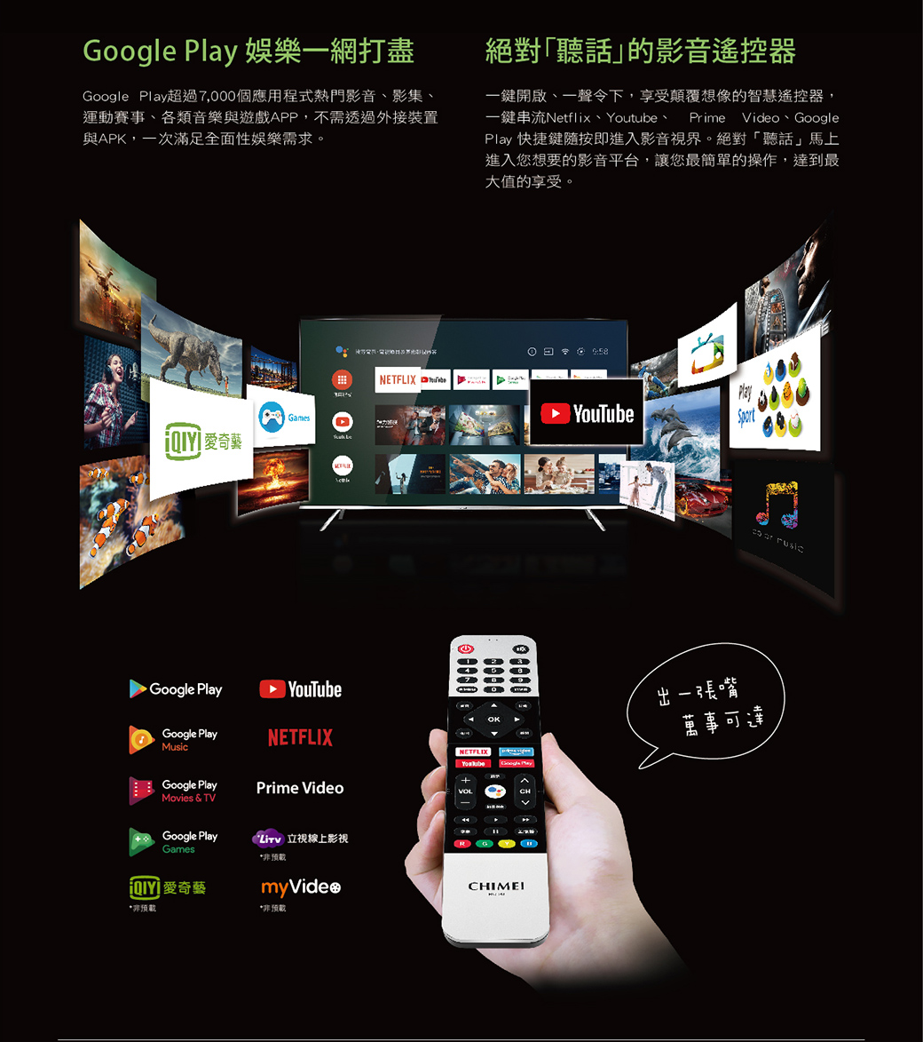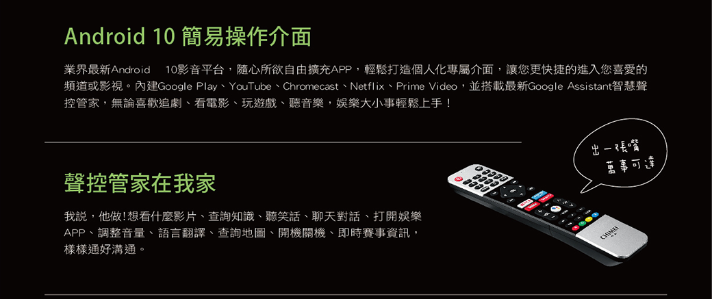 ■ 內建影視平台:Netflix /Prime Video /YouTube(遙控器一鍵啟動)