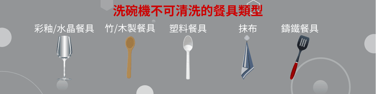 彩釉餐具、水晶餐具:餐具上的鑲色較薄,容易被洗碗機高壓水柱損壞。